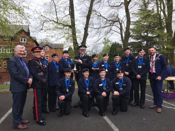 Teams of Cadets from many areas of Greater Manchester, including Oldham, Irlam, Hyde, Trafford, Bolton, Ashton & Blackley, were tested in many different policing skills and prizes were awarded for each category. Prizes were presented by, amongst others, The Chief Constable, The Police Commissioner, Tony Lloyd and the Lord Mayor of Manchester, Councillor Carl Austin-Behan. Gerry was delighted to award the prize for Drill skills.